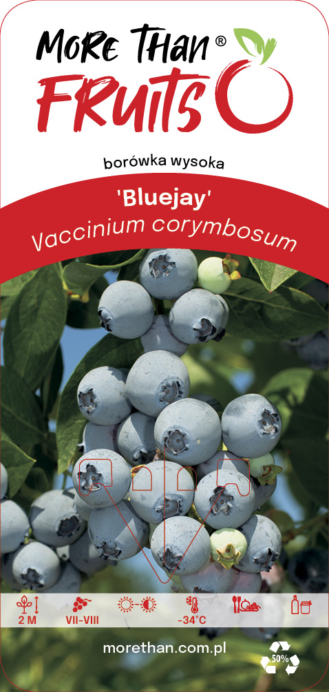 Det amerikanska blåbäret Bluejay är en rikbärande och starkväxande sort som blir ca 2 meter hög. Bären är medelstora och har mild smak. Bären mognar i augusti. För att få riklig skörd krävs att Bluejay korspollineras och ska därför samplanteras med en eller flera andra blåbärssorter. Vilda blåbär kan inte pollinera amerikanska blåbär. Förutom att vara något av ett apotek på rot så är blåbärsbusken även dekorativ med sina vita blommor, färgstarka bär och med bladens flammande höstfärg.