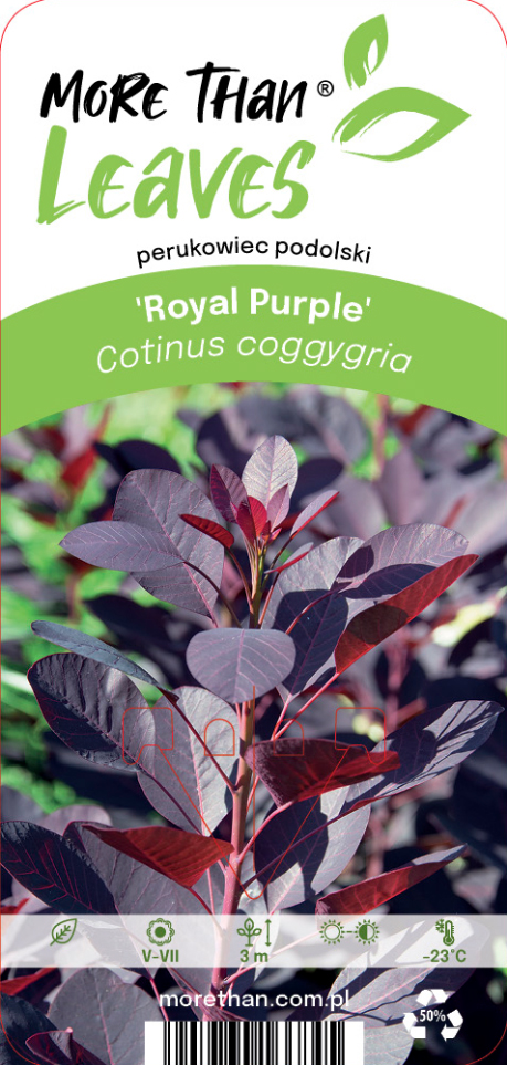 Praktfull buske som ger en spännande kontrastverkan med sina mörkt vinröda till mörklila ovala blad. Bildar en medelstor buske med luftigt, buskigt och brett växtsätt. Blommar med gula skira blommor i ett rikt flor som uppskattas av våra pollinatörer. Blommorna sitter på stora purpurröda, hårlika plymer som efter blomningen lägger sig över busken likt en peruk, därav namnet. Bladen får orangeröda och gula höstfärger.