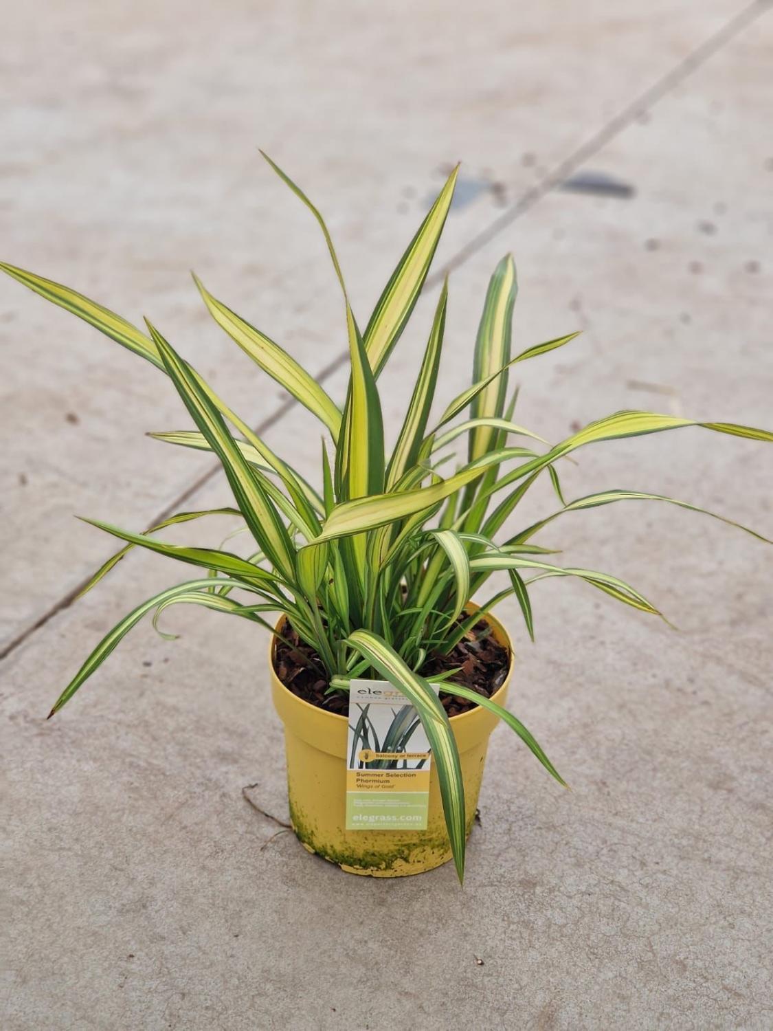 Phormium Wings of Gold växt i en gul kruka på en betongyta.